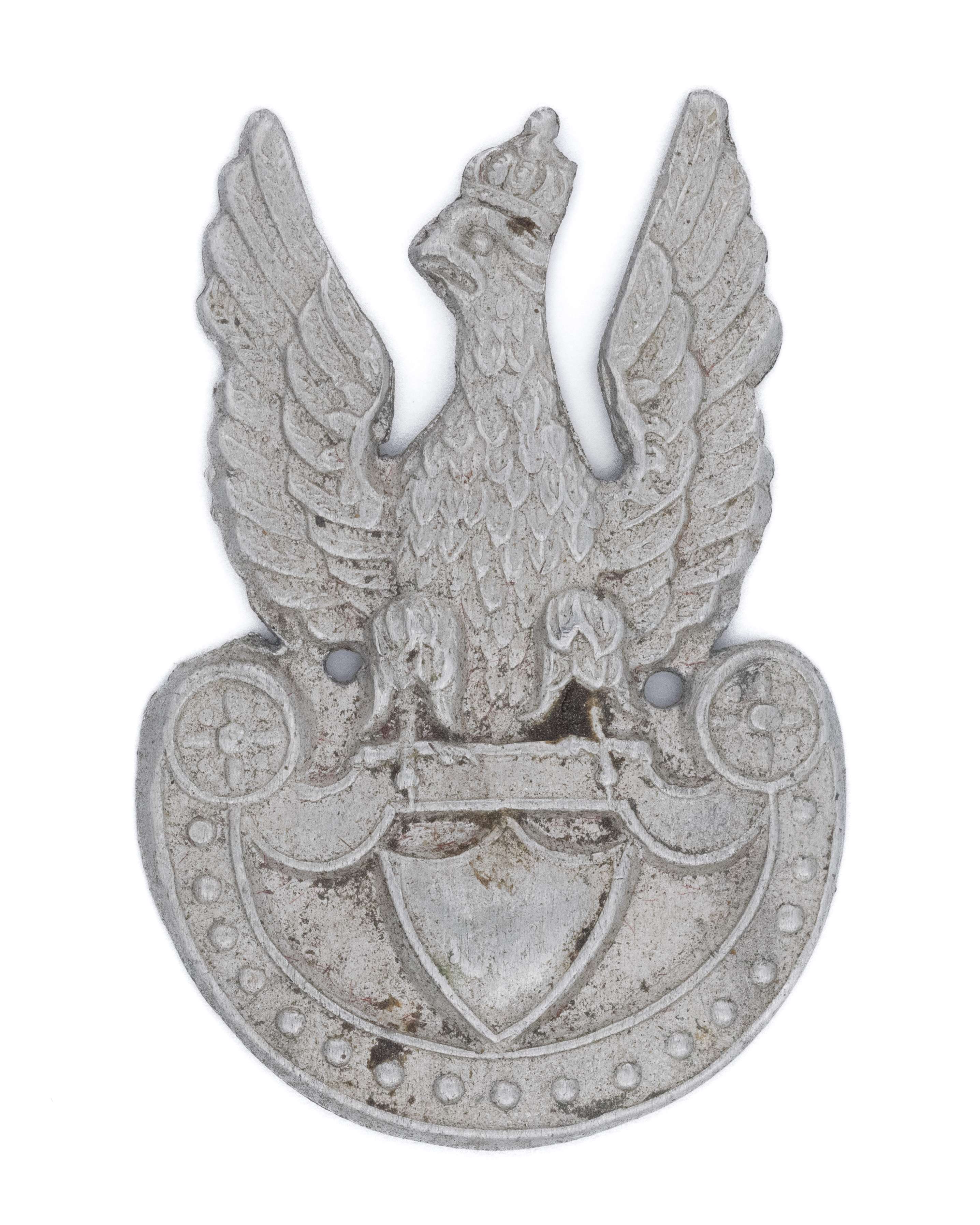 Orzeł wykonany na terenie okupowanych Niemiec. 44 x 29mm. Wykonany z aluminium. Rewers gładki. Dziurki do przyszycia. Noszony min. w Oddziałach Wartowniczych. Lit. Tomasz Zawistowski, Polskie orły do czapek w latach 1939-45, str. 87. Stan bardzo dobry.