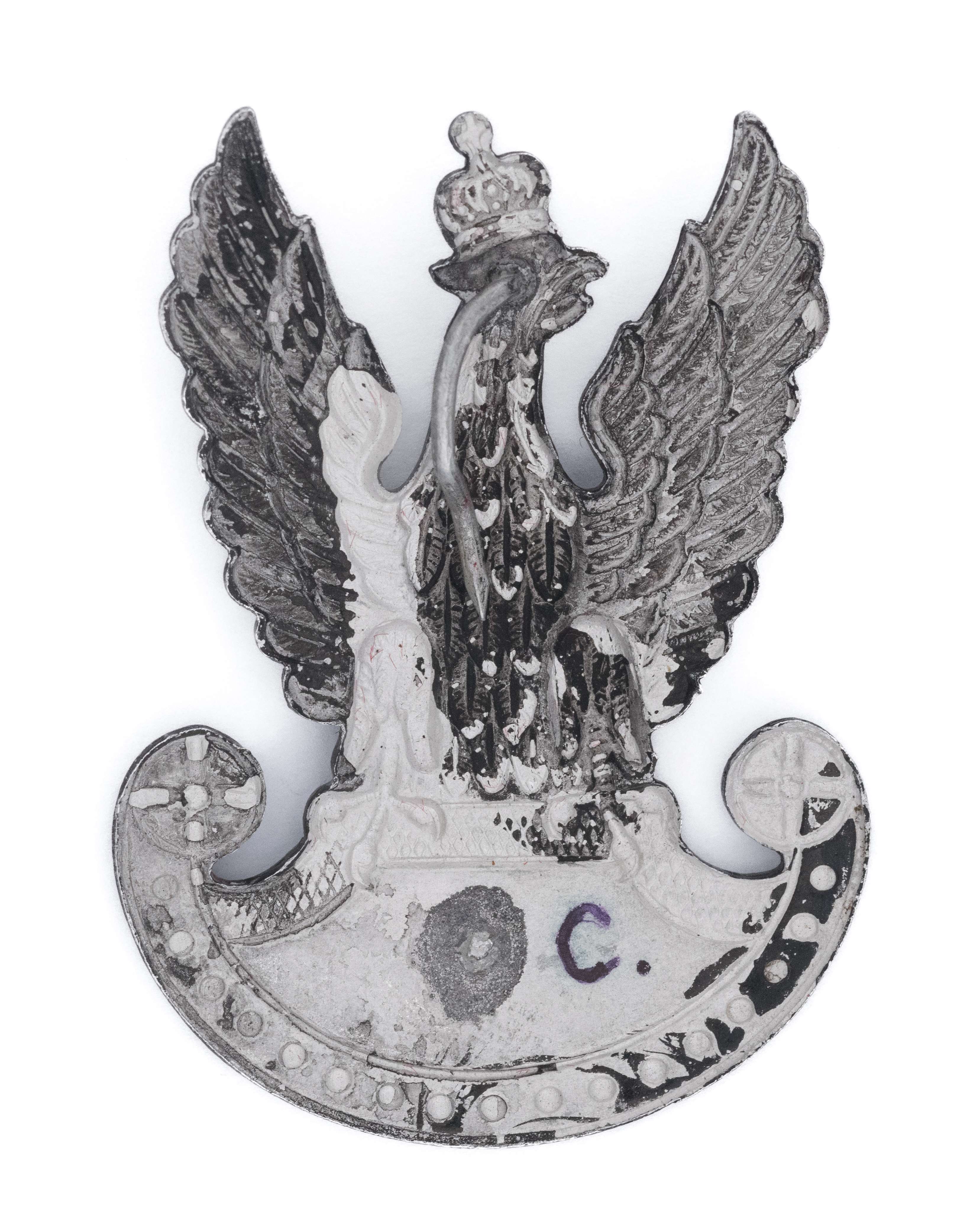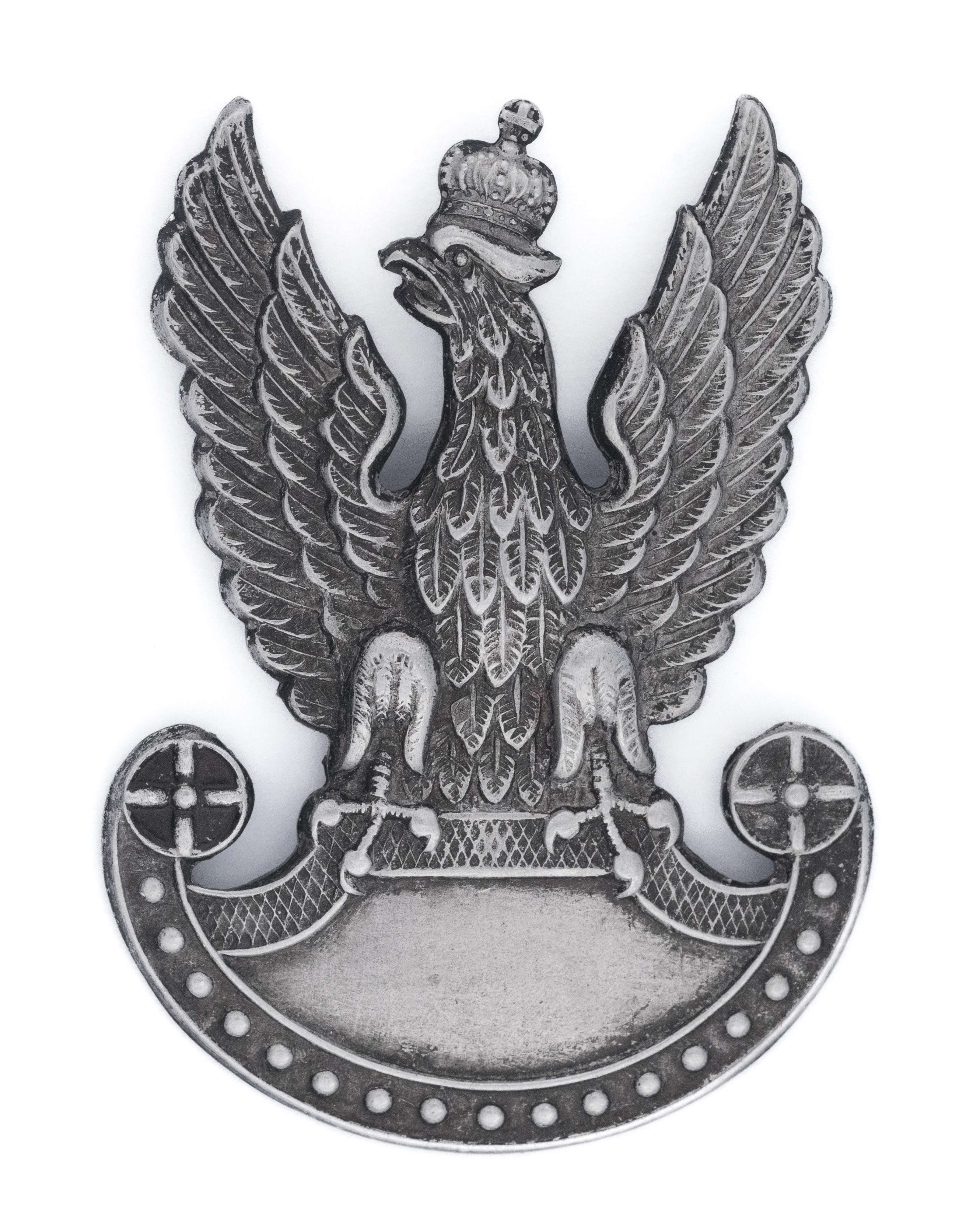 Orzeł wykonany na terenie okupowanych Niemiec. 49 x 35mm. Wykonany z aluminium. Rewers gładki. Mocowany na dwa druty- jeden urwany. Noszony min. w Oddziałach Wartowniczych. Lit. Tomasz Zawistowski, Polskie orły do czapek w latach 1939-45, str. 87. Stan bardzo dobry.