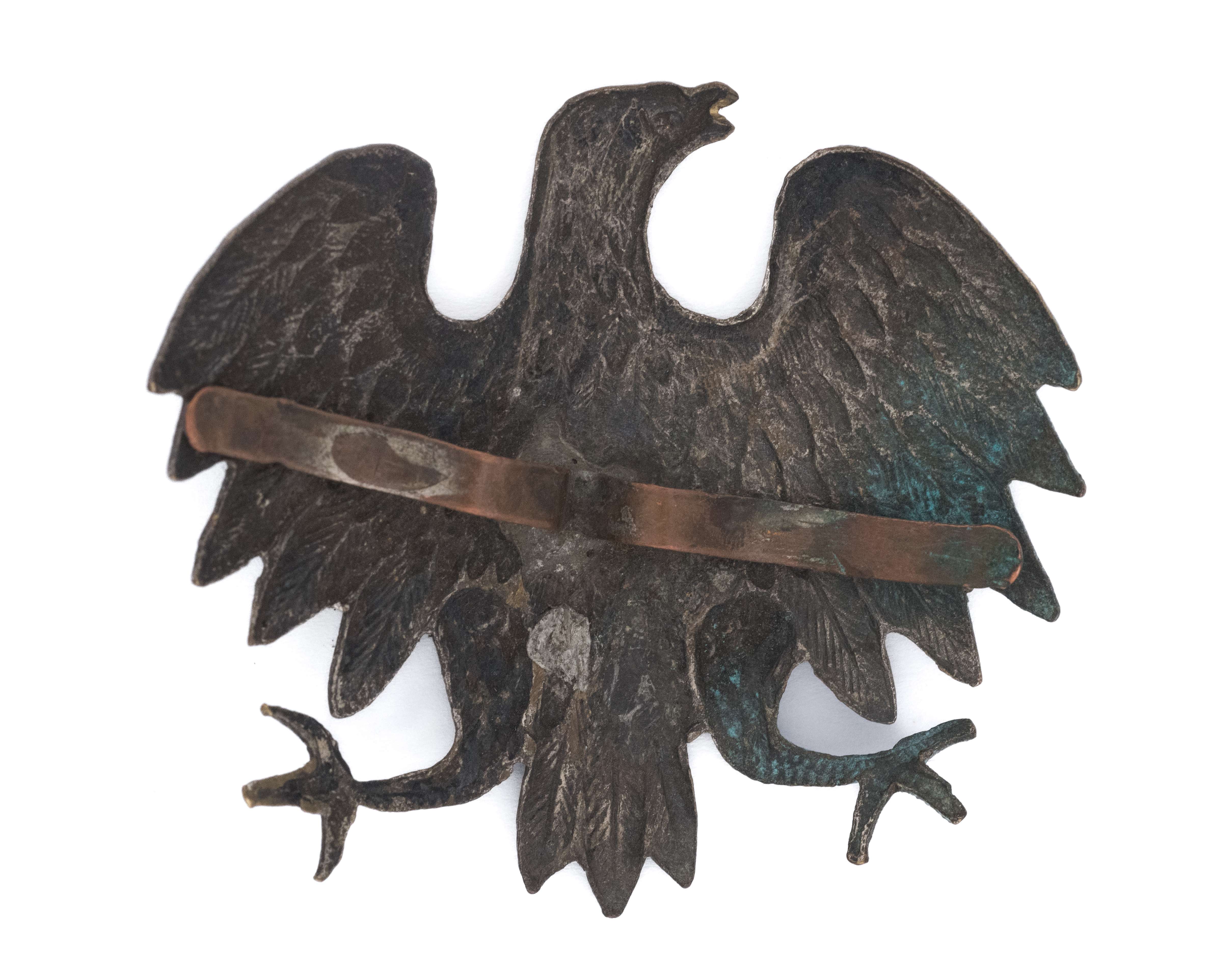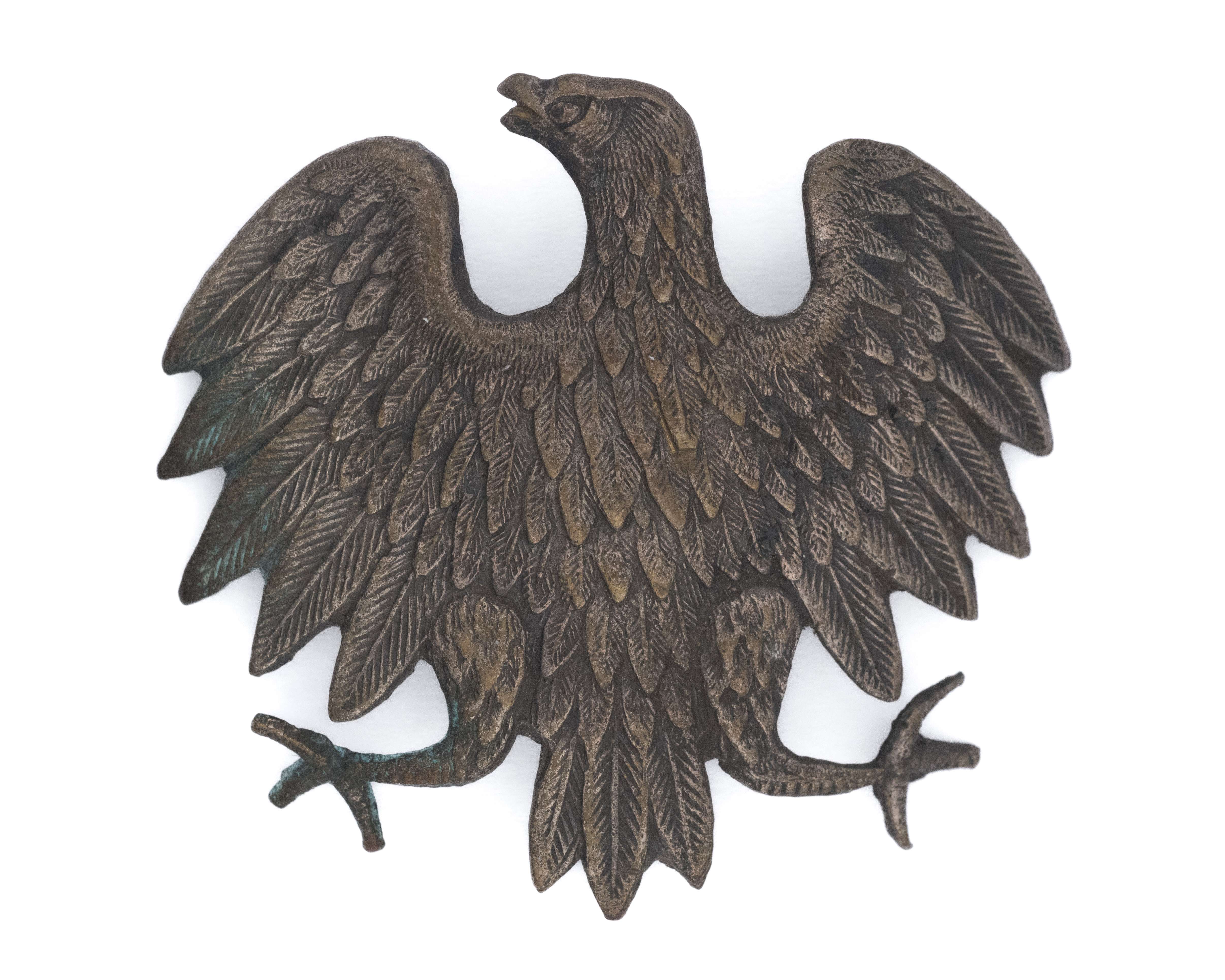 Orzeł wz. 43, tzw. kurica - wykonanie wojenne. 49 x 43mm. Wykonany z mosiądzu. Rewers z kontrą. Mocowany na płaską blaszką. Lit. Tomasz Zawistowski, Orzeł wz. 43, w - Mundur i Broń, zeszyt 5, str. 24, fot. 15. Stan bardzo dobry.