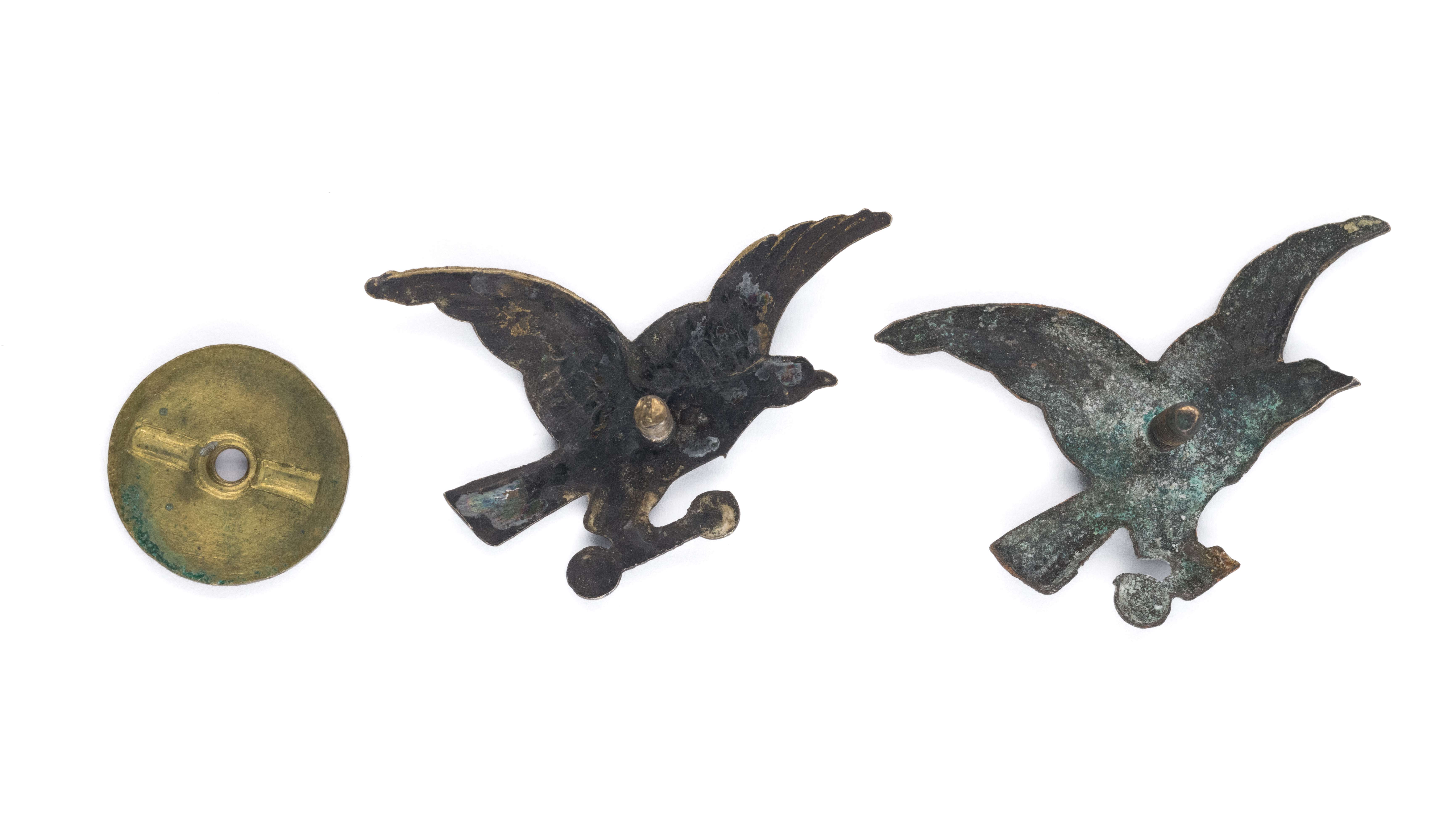 Zestaw 2 odznak; 1) Odznaka Towarzystwa Gimnastycznego Sokół, 44 x 29mm, mosiądz. Brak nakrętki, część odznaki urwana. 2) Odznaka Towarzystwa Gimnastycznego Sokół, 45 x 29mm, mosiądz. Mocowanie na słupek z nakrętką sygn.: "WYDZ. DOSTAW SOKOLICH WARSZAWA". Stany dobre.