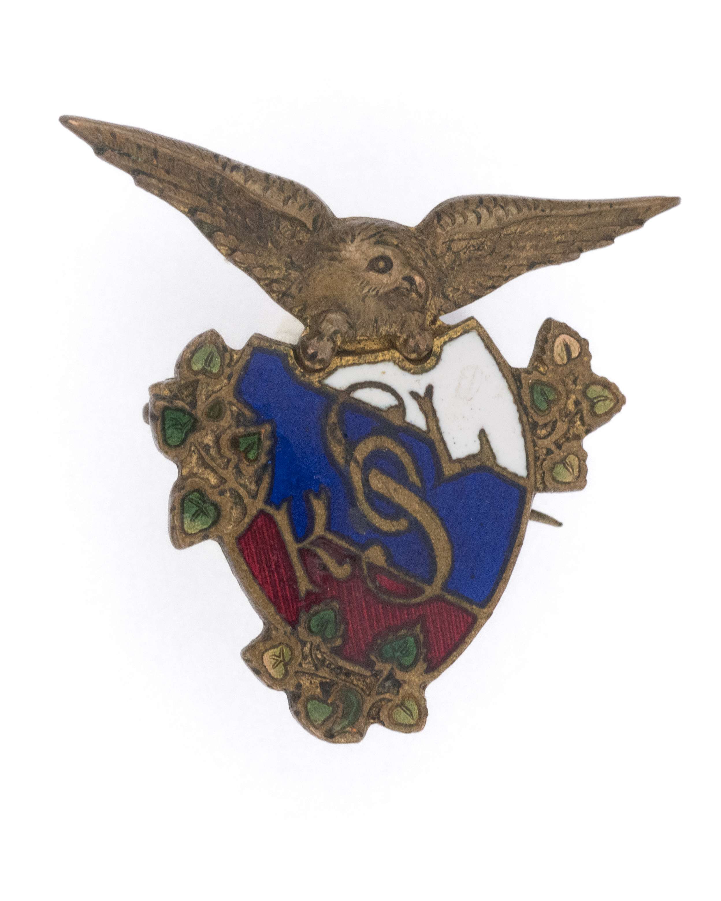 Odznaka Towarzystwa Gimnastycznego Sokół, Zaszczytna Odznaka Sokoła; 23 x 20mm, mosiądz, emalia: biała, granatowa, czerwona, zielona. Mocowanie na agrafkę. Stan dobry.