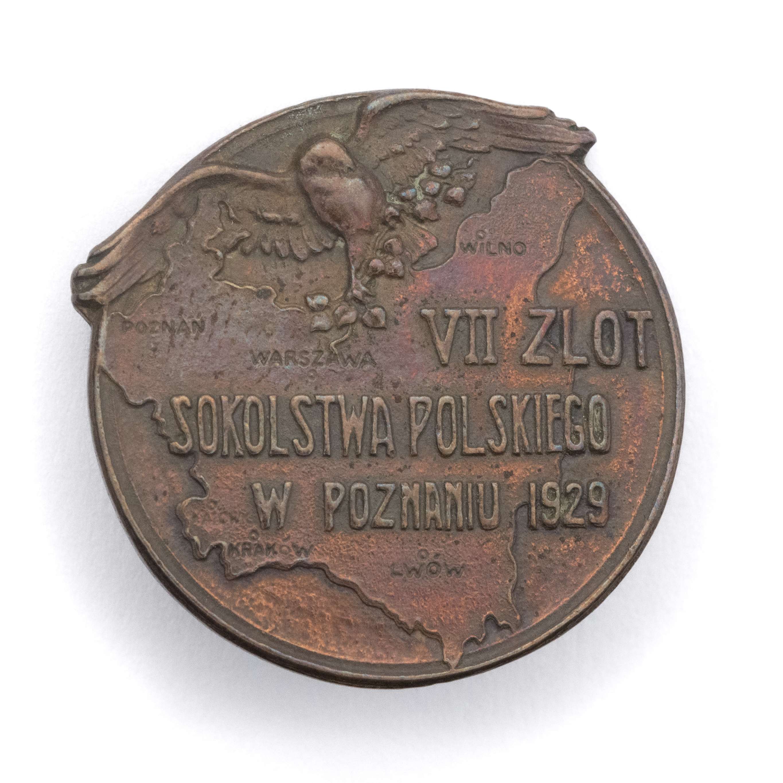 Odznaka Towarzystwa Gimnastycznego Sokół, VII ZLOT SOKOLSTWA POLSKIEGO W POZNANIU 1939; śr. 24mm, mosiądz. Mocowanie na agrafkę. Stan dobry