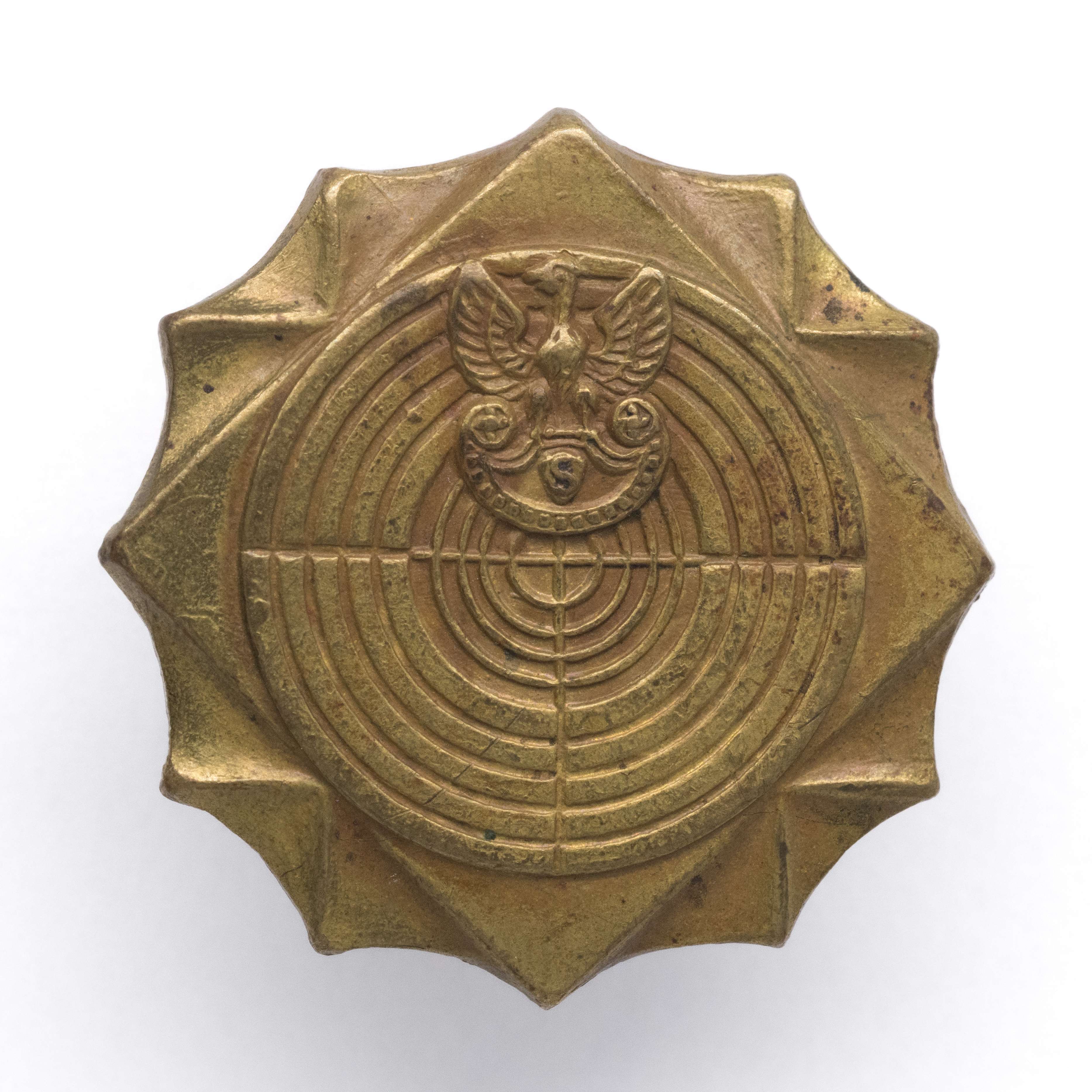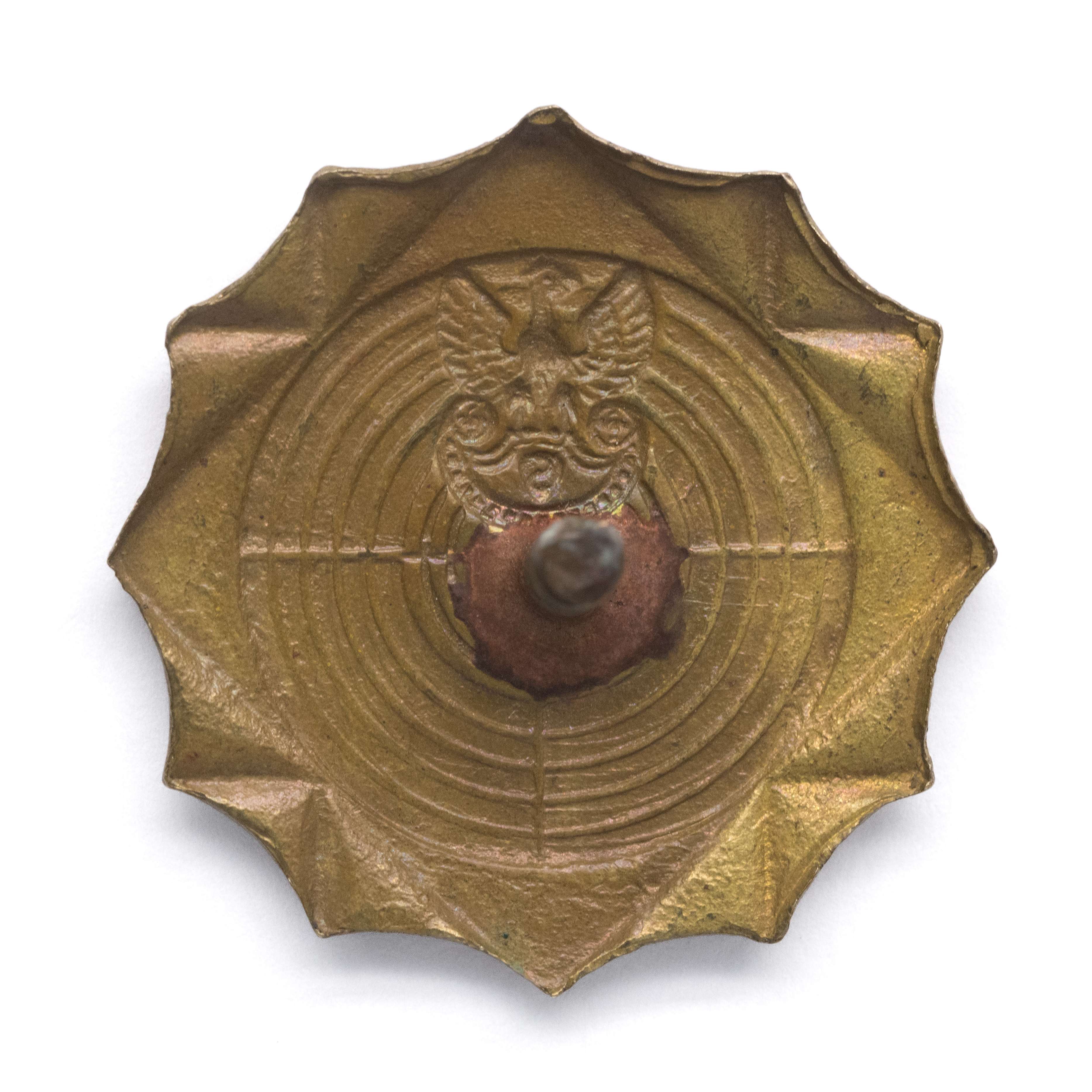 Odznaka strzelecka; 32 x 32mm, rewers z kontrą, mocowanie na dolutowany słupek, brak nakrętki, stan dobry.
