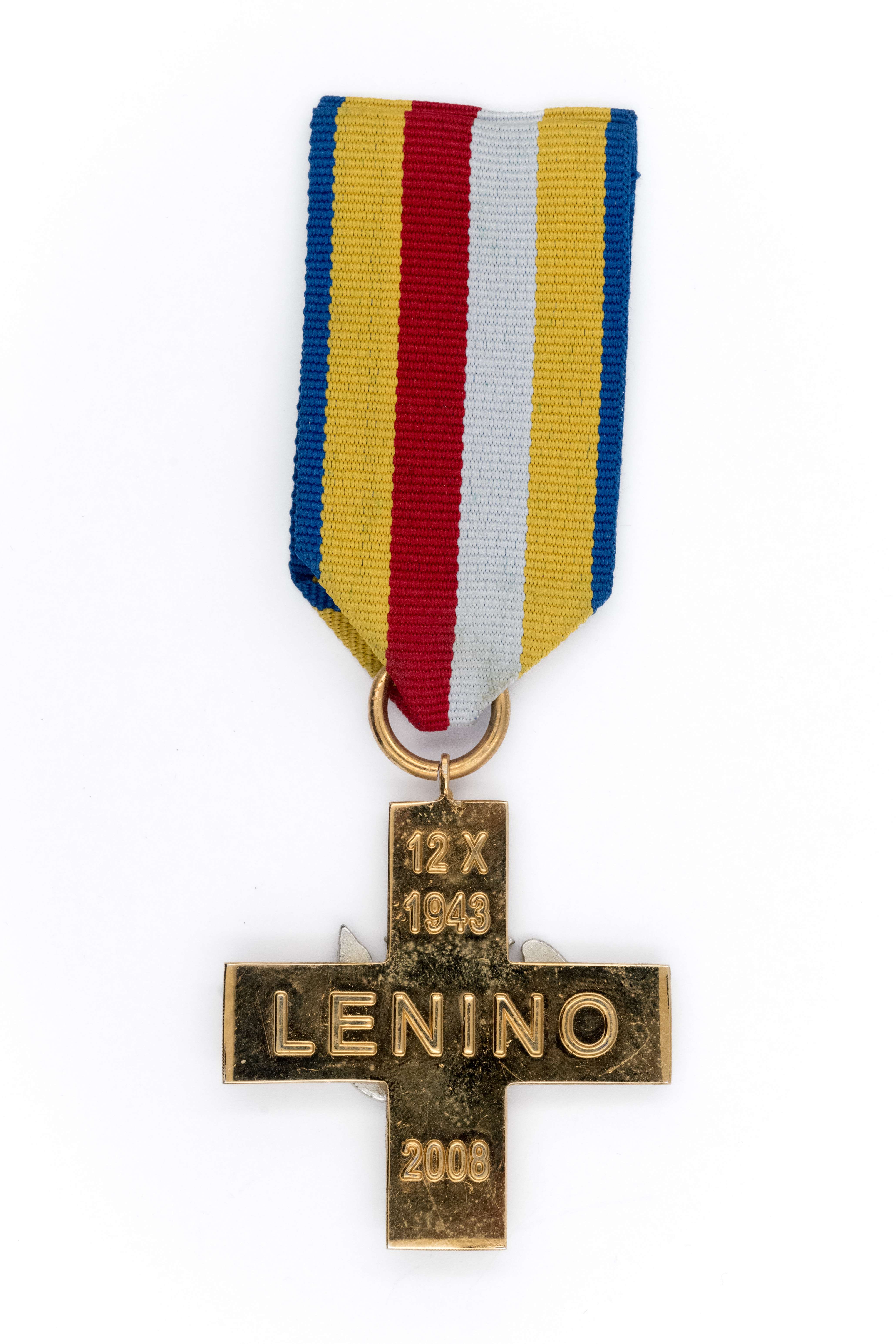 Odznaka 65 rocznica Bitwy pod Lenino; 44 x 44mm. Stan bardzo dobry - zachowana oryginalna wstążka. Z odznaką legitymacja z 2010 roku na nazwisko Trąba Zygmunt, 9 x 6,1 cm.