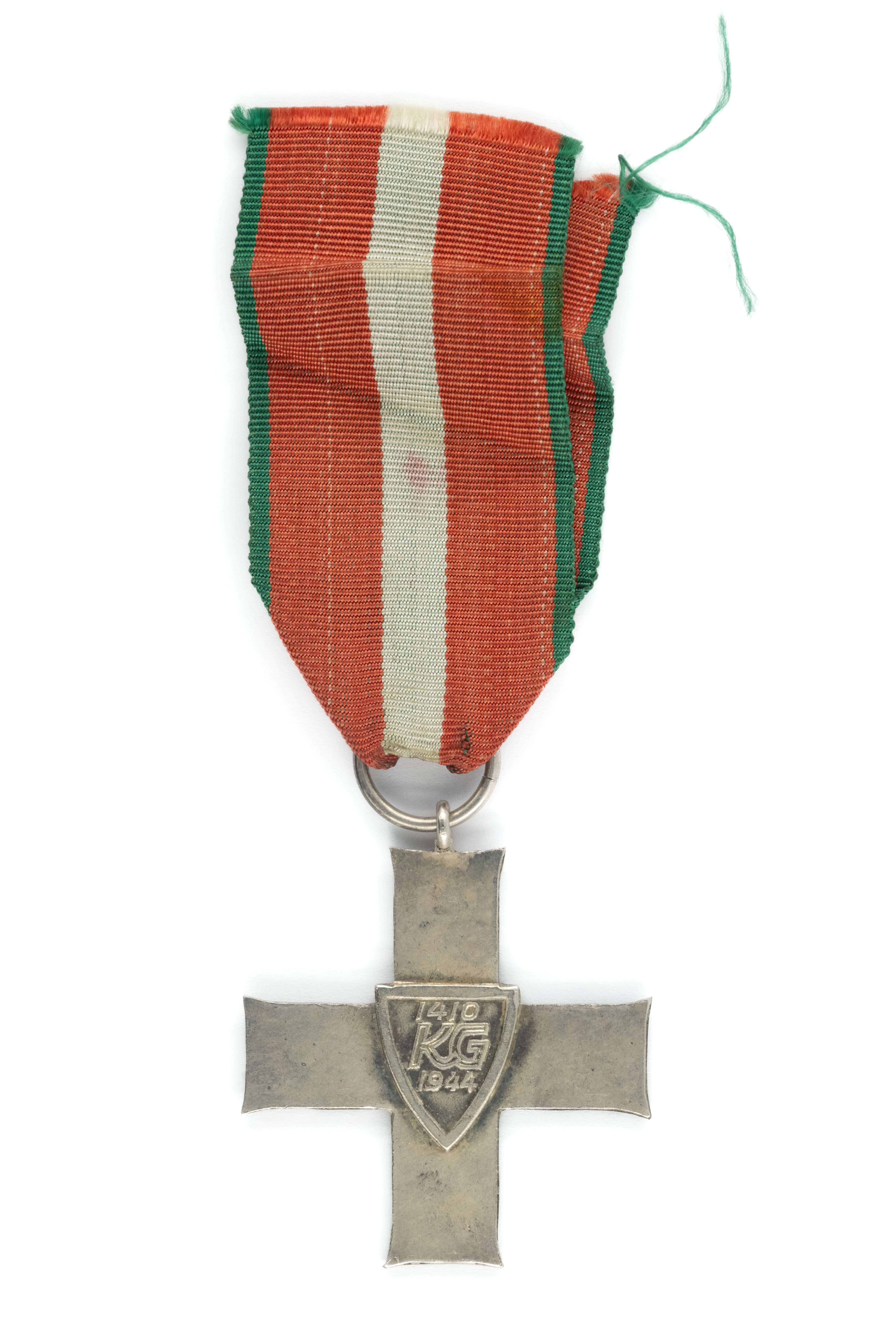 Order Krzyża Grunwaldu II klasy. 45x 56 x 2,8mm, 15,8gr. Wykonany z metalu (brąz?) srebrzonego. Zawieszony na oryginalnej starej wstążce. Stan bardzo dobry.