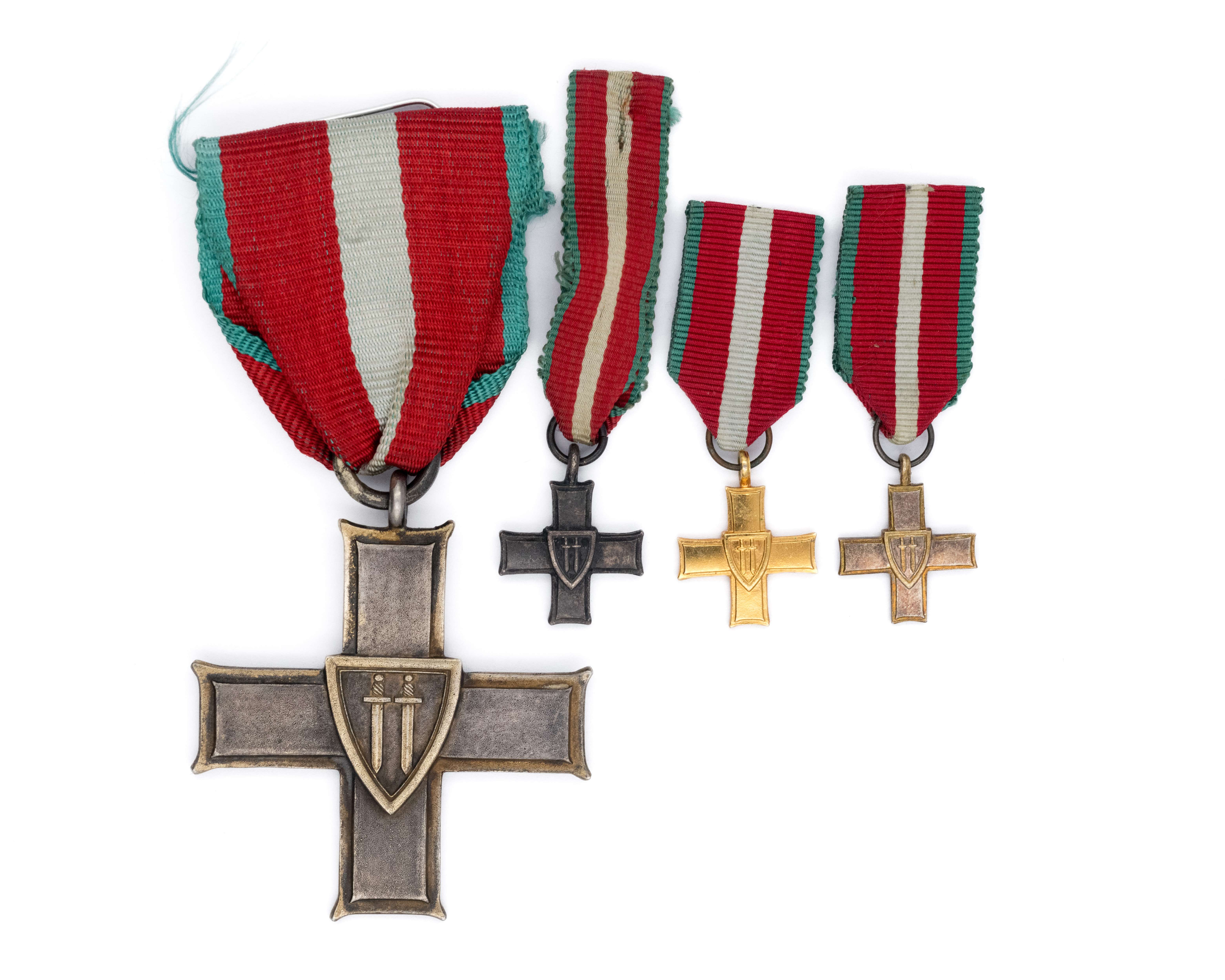 Krzyż Grunwaldzki z trzema miniaturami. 45 x 45mm, tombak srebrzony, stan bardzo dobry - zachowane oryginalne wstążki.