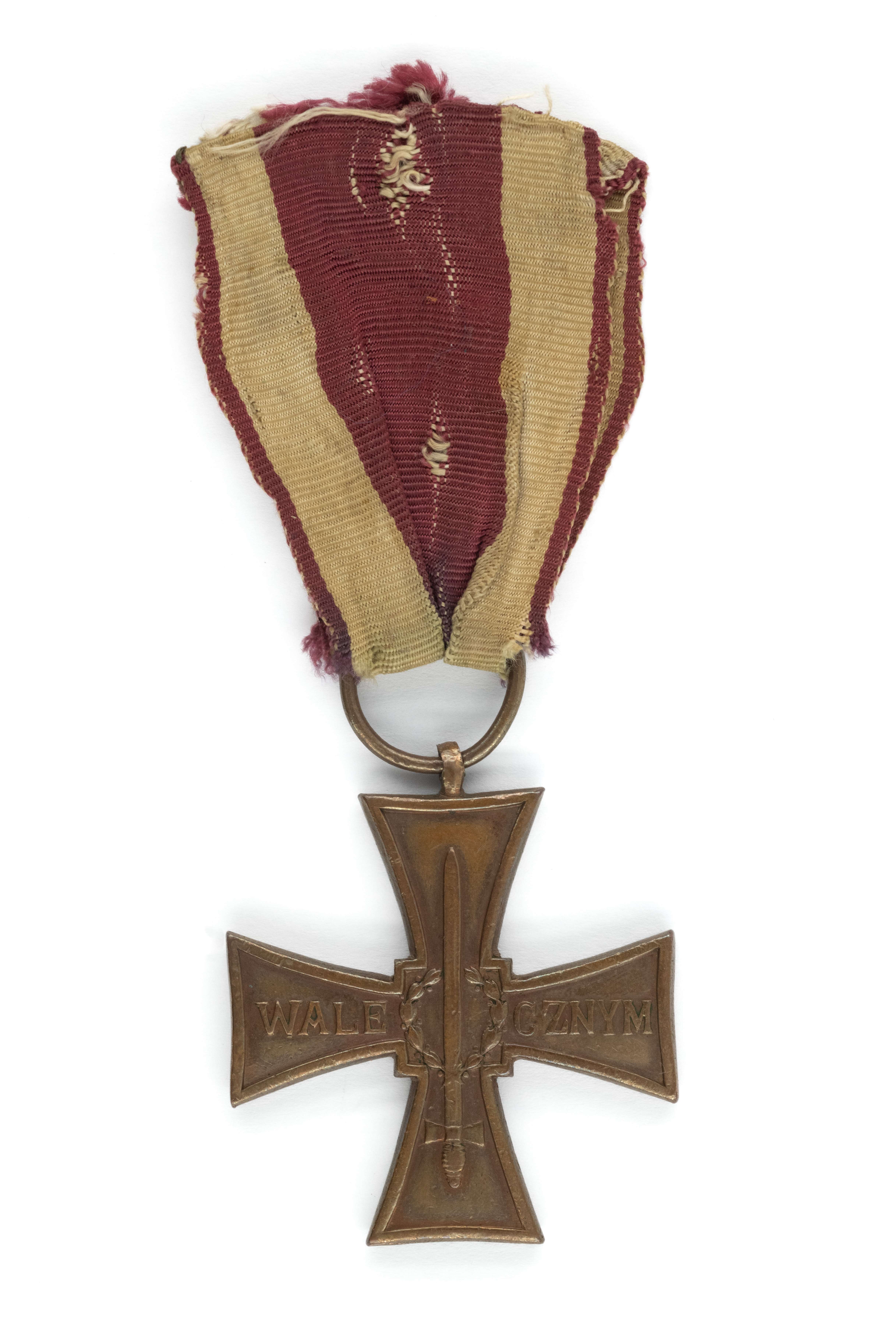 Krzyż Walecznych 1943 - Moskiewskie Mechaniczne Zakłady Matryc (Moskiewski Stampowoczno - Mechaniczeskij Zawod). 43,3 x 48,1mm 27,1gr.Wykonany w brązie. Łącznik zalutowany. y. Zawieszony na oryginalnej wstążce. Stan bardzo dobry. Lit. Mariusz Pecio, Katalog zbioru falerystycznego Krzyży Walecznych, wyd.2, str. 159-163. wg G. Krogulca nr L2. Stan bardzo dobry - widoczne ślady noszenia. Jedna z najrzadszych odmian KW!!