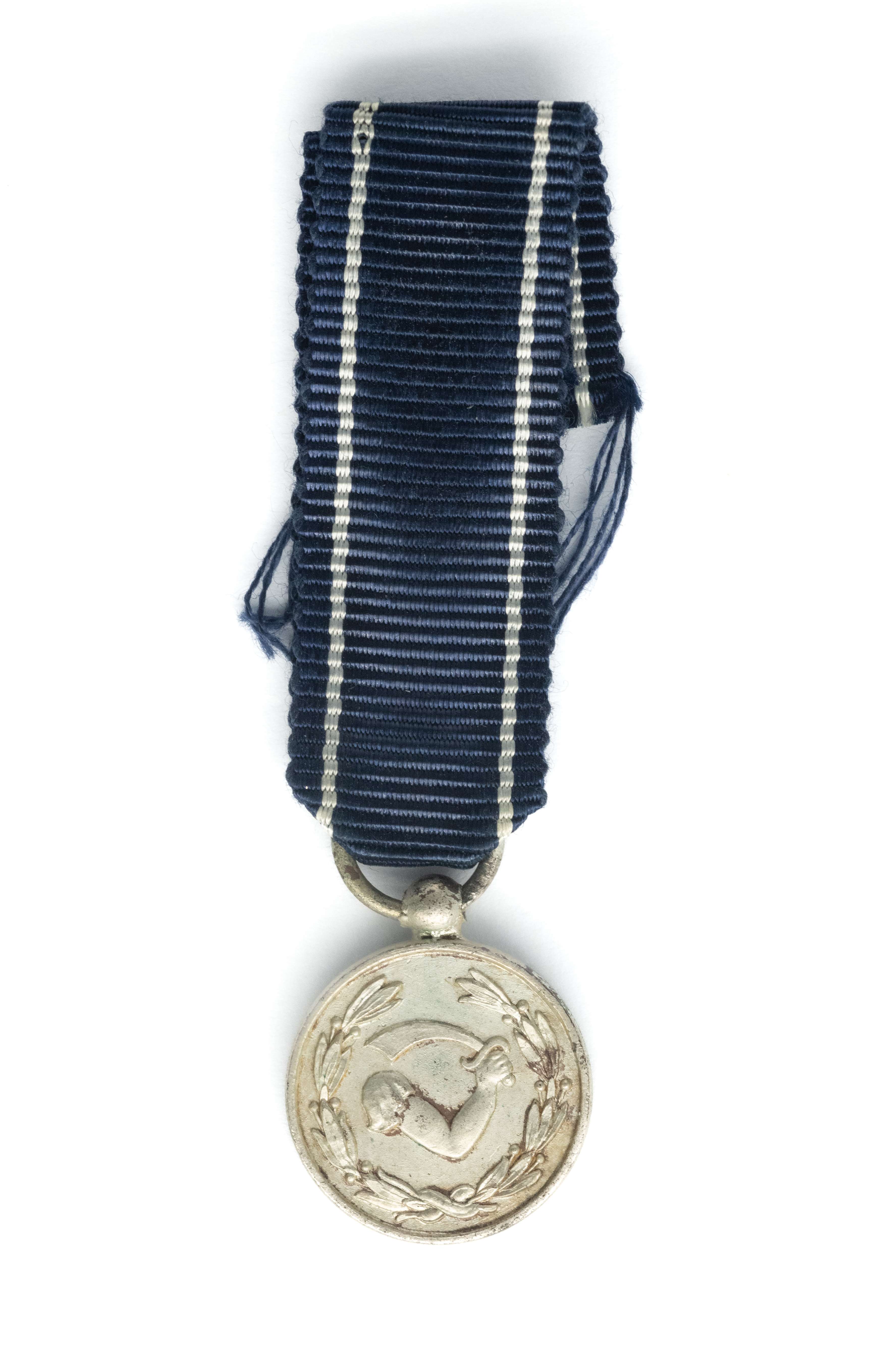 Miniatura medalu Polska Swemu Obrońcy - Medal Morski. Średnica 15mm. Wykonany z metalu srebrzonego. Zawieszony na wstążce. Stan bardzo dobry.