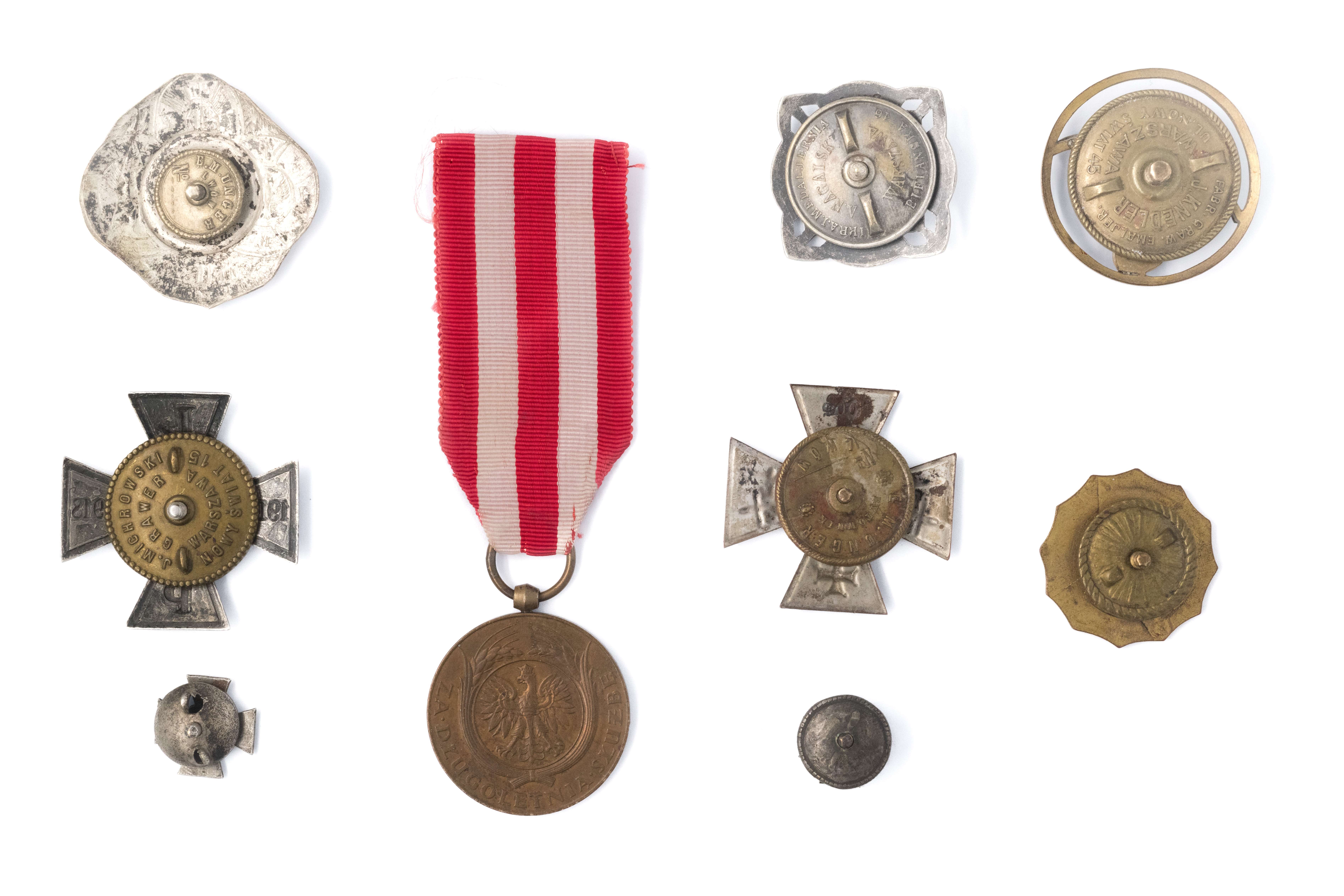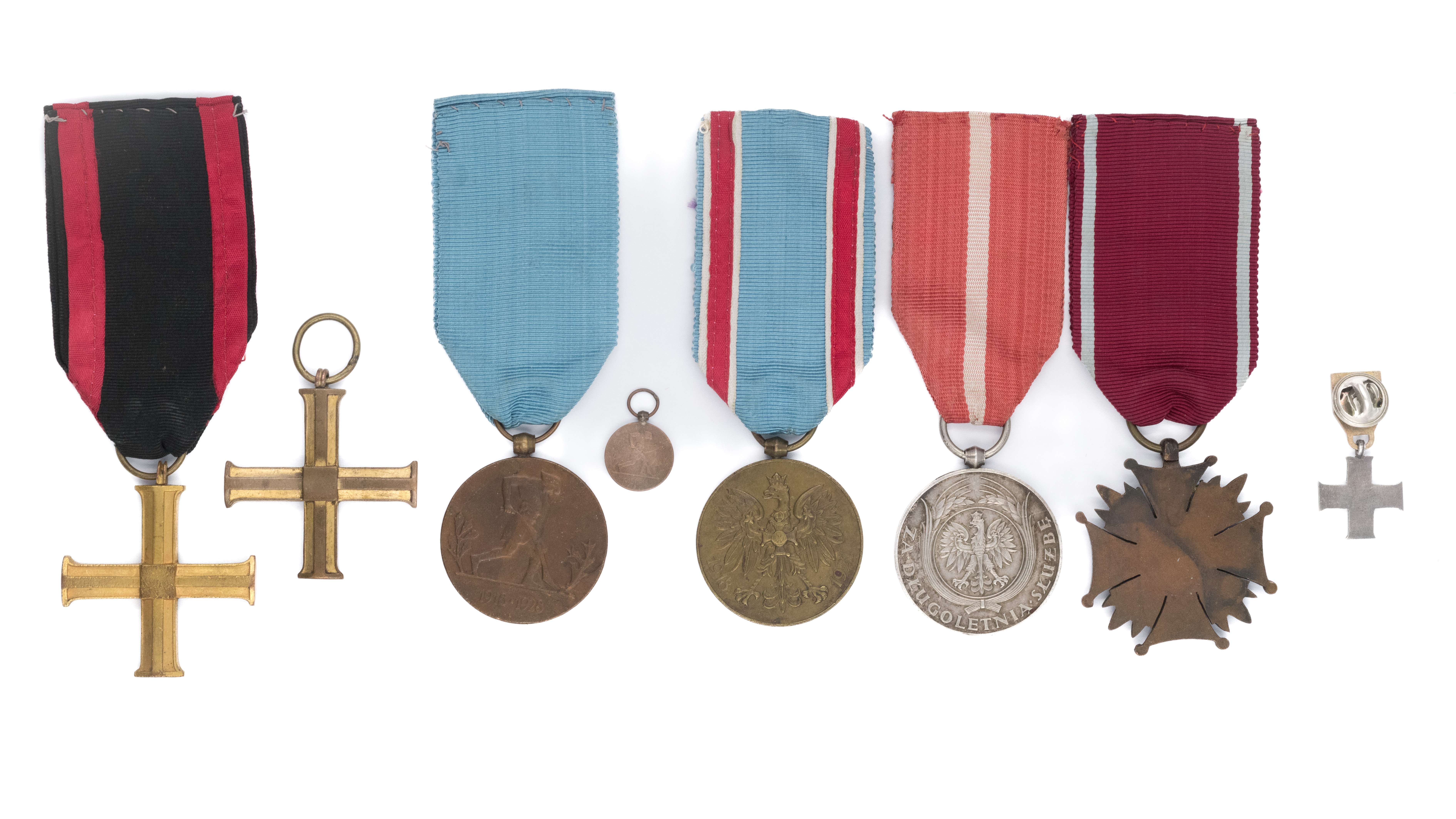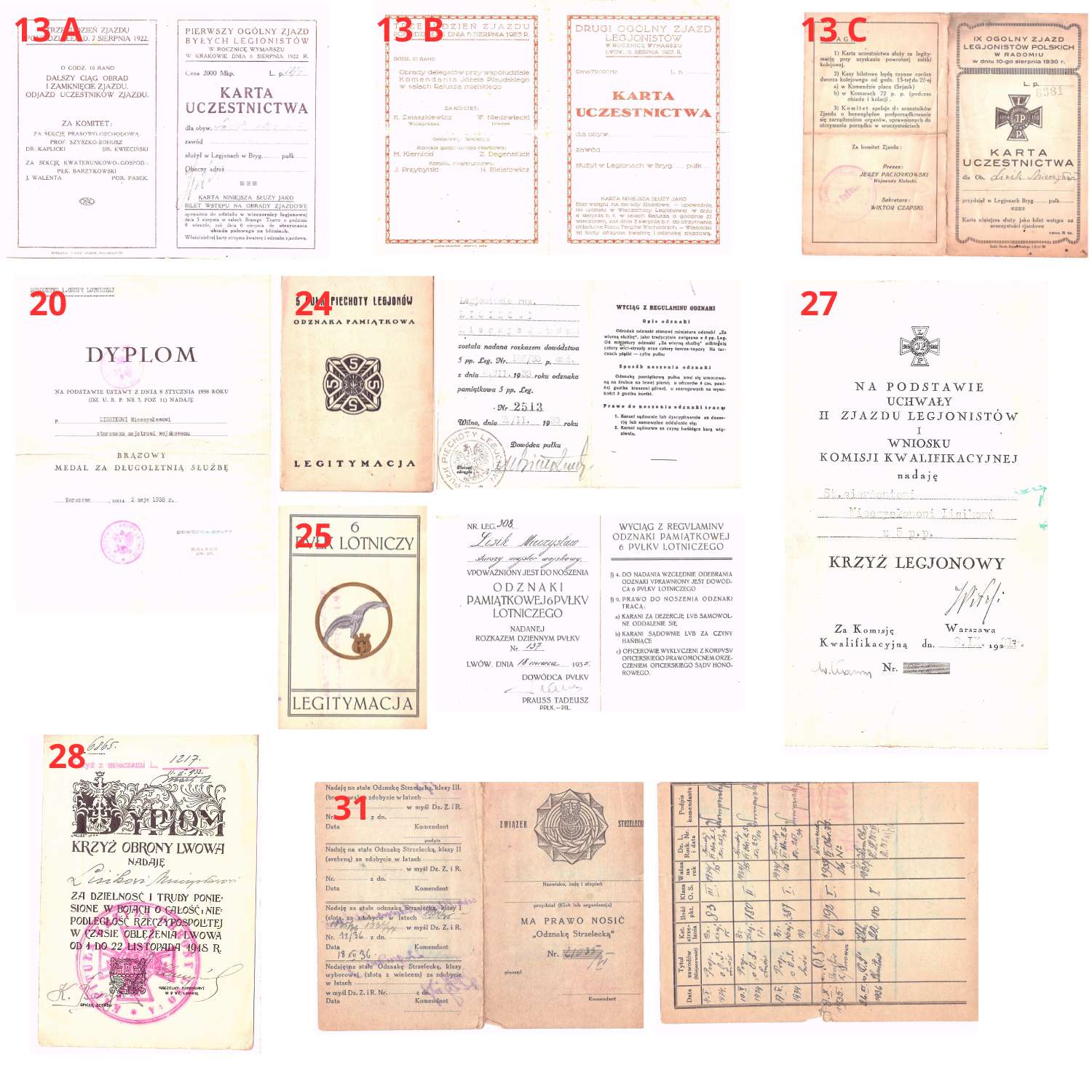 24) Krzyż legionów z miniaturą i dokumentem nadania, metal srebrzony, bity z kontrą, mocowanie na słupek z nakrętką sygn. J. Michrowski Grawer Warszawa Nowy Świat 15, 25) Krzyż Obrony Lwowa z mieczami i orderem V.M., miniaturą, dyplomem, oraz legitymacją Związku Obrońców Lwowa z 1918, mosiądz srebrzony, bity z kontrą, na rewersie nr 400, mocowanie na słupek z nakrętką sygn. E.M. Unger Rytownik N2 Lwów,