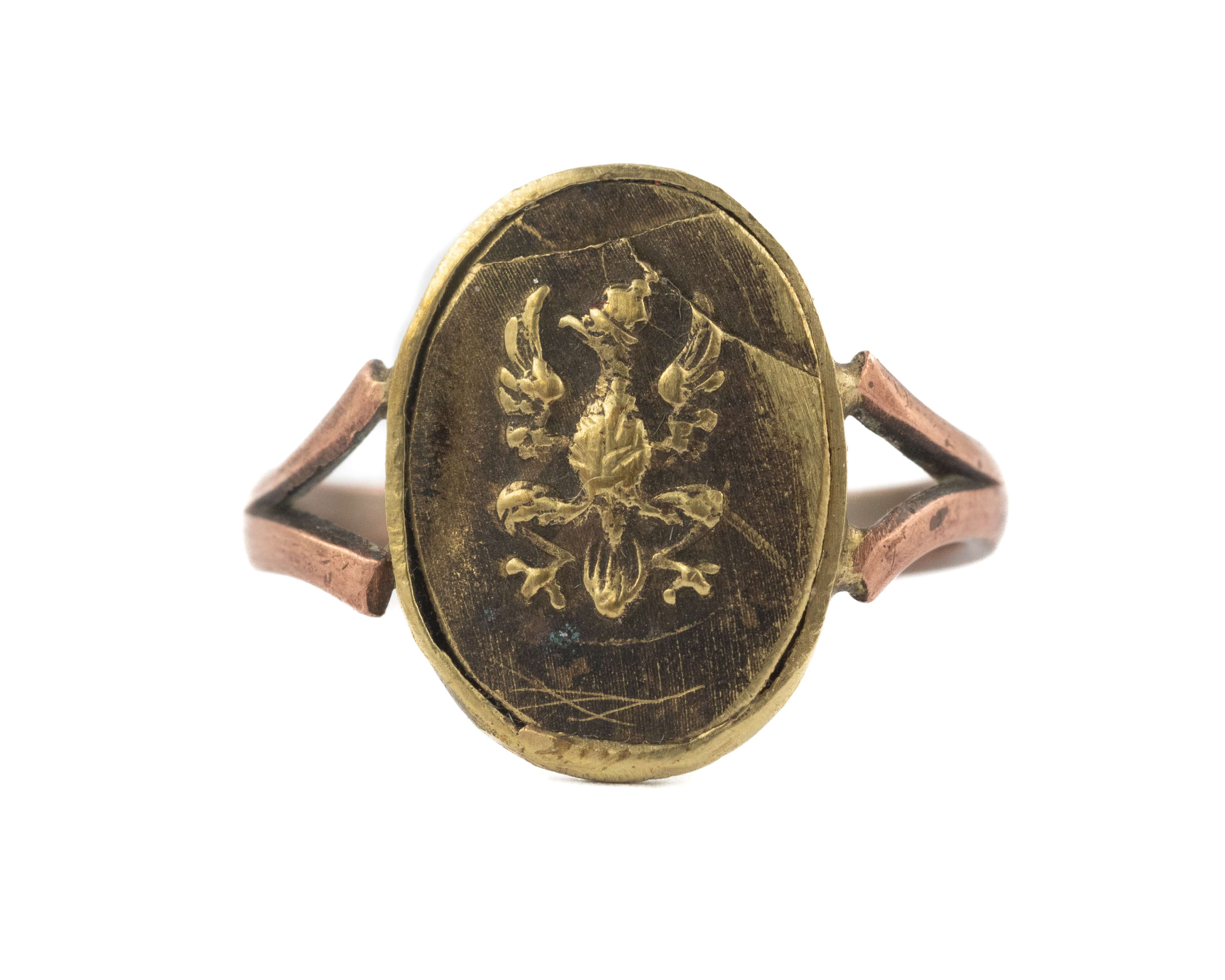 Sygnet patriotyczny z orłem. Średnica ~17mm. Wykonany w mosiądzu, wieloczęściowy - orzeł wybity matrycowo i mocowany w obsadce. Stan bardzo dobry.