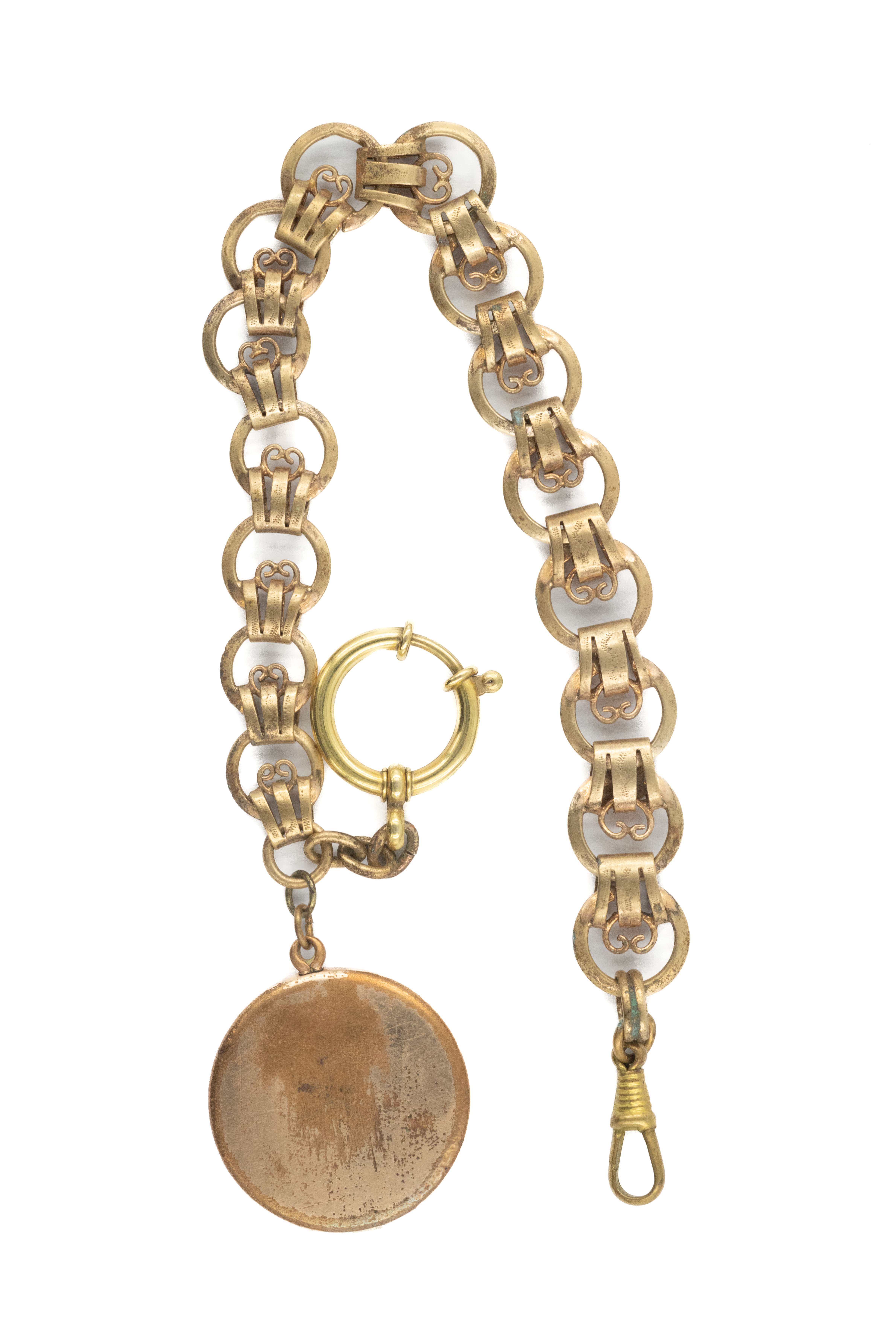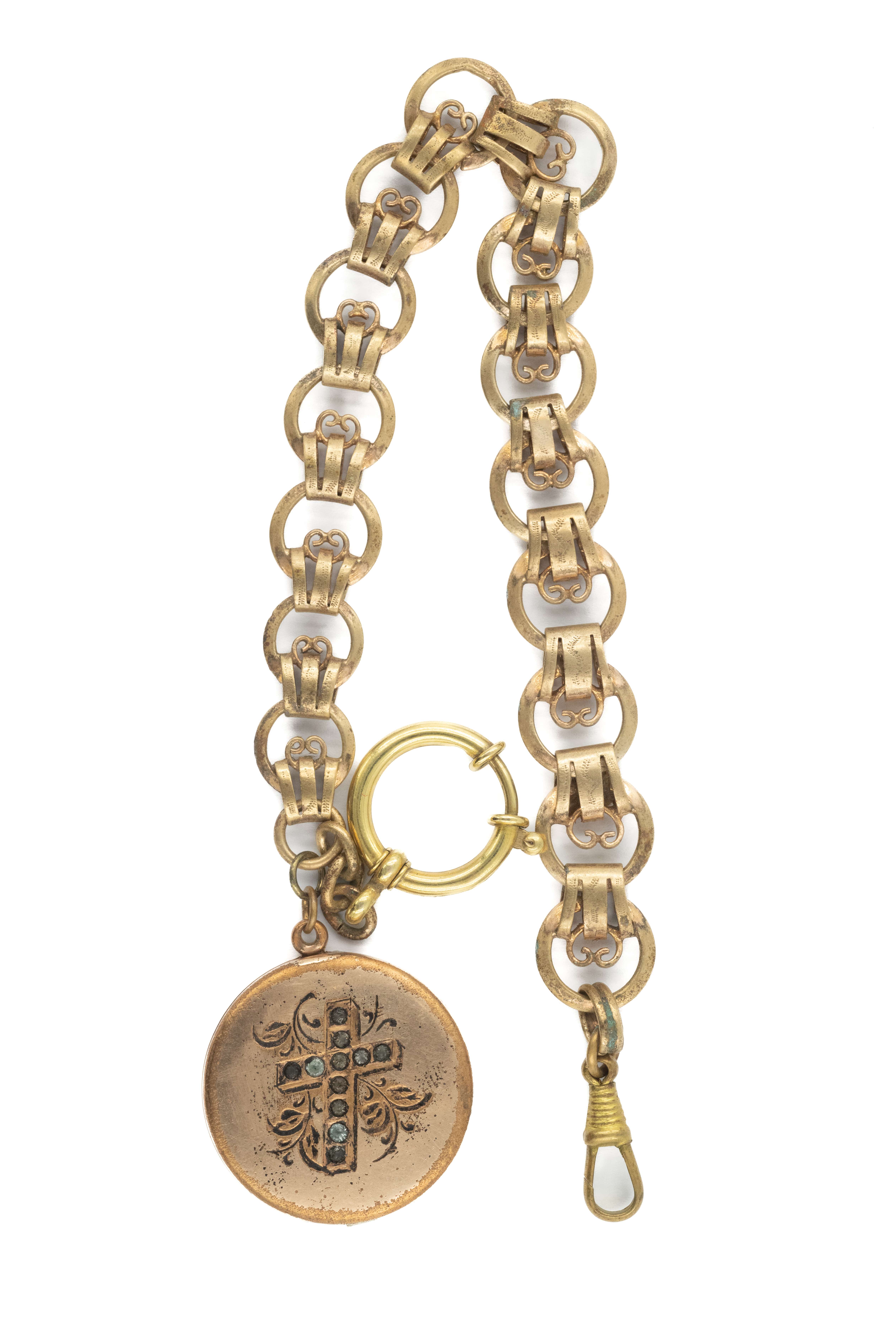Dewizka żałobna(?) z krzyżem i sekretnikiem. Medalion średnica 30mm, otwierany - wewnątrz zdjęcie pary. Dewizka 22cm, mosiądz złocony. Stan dobry, przetarcia złocenia.