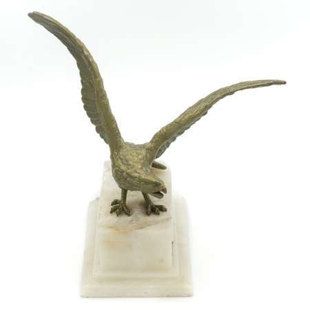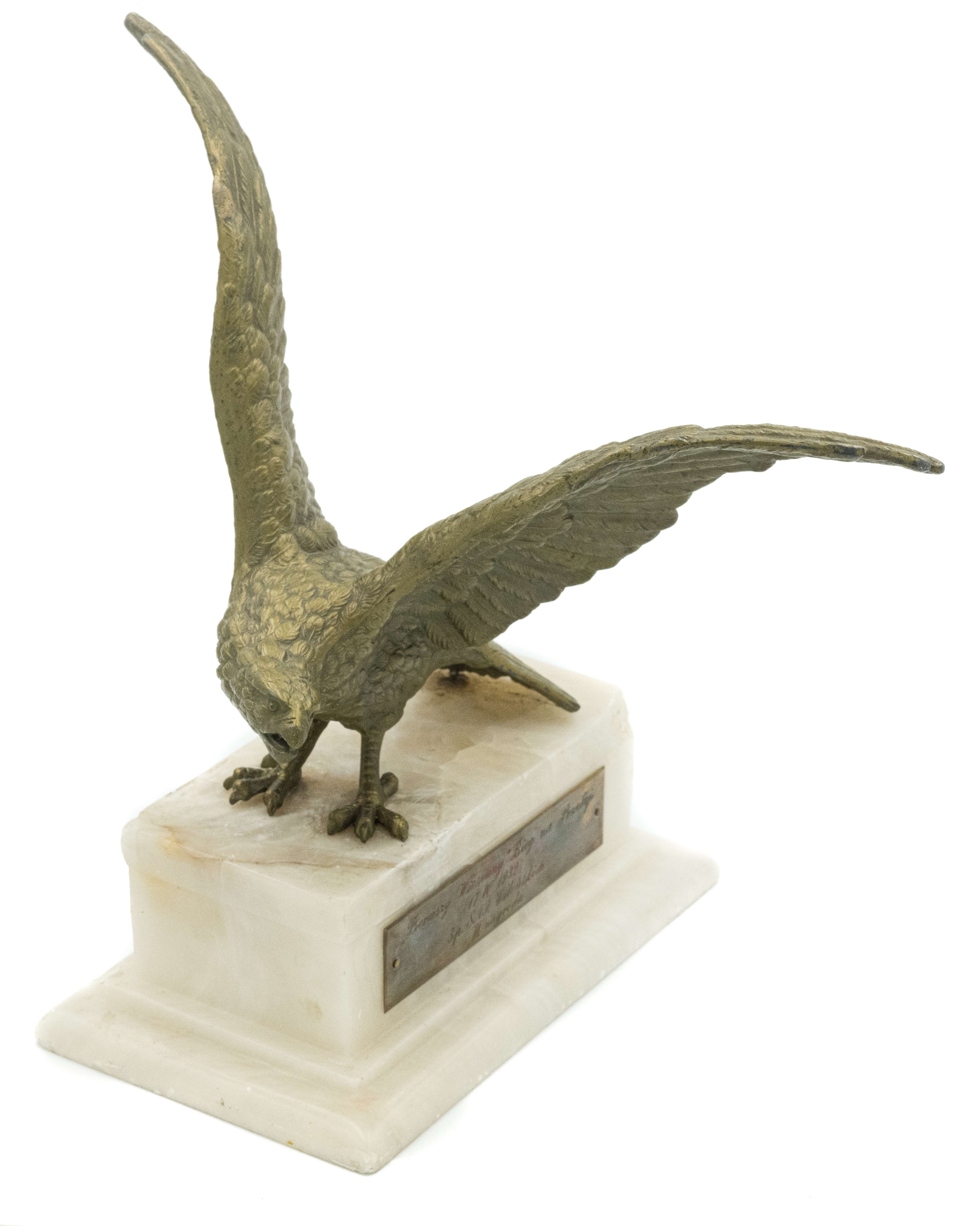 Statuetka Orzeł z rozpostartymi skrzydłami. 27 x 20 x 12cm, brąz na marmurowym postumencie z tabliczką. Na tabliczce grawer: Pierwszy Wiosenny Bieg na Przełaj / 17 IV 1932 / 3p. SAP. Wileńskich / III nagroda. Stan bardzo dobry.
