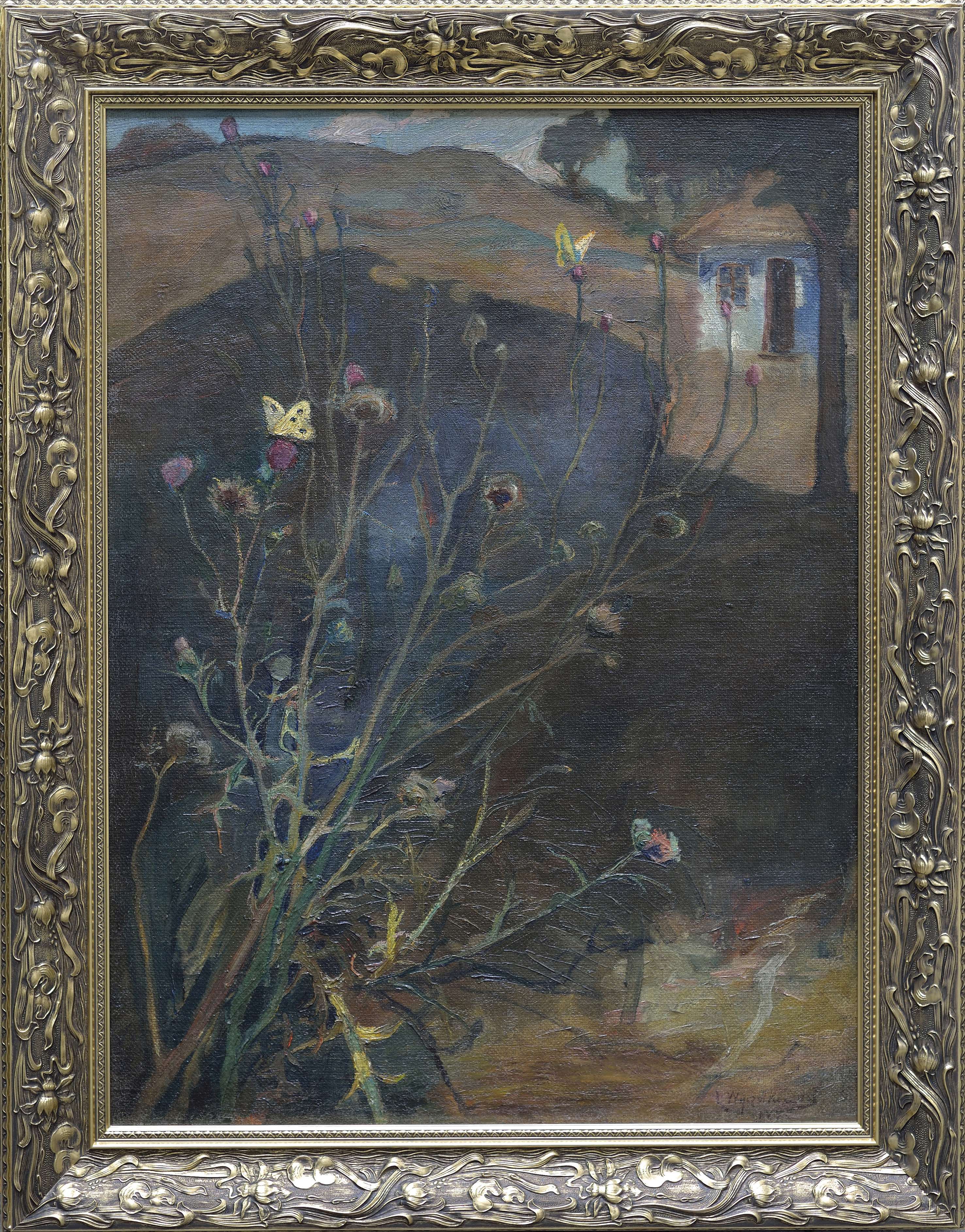 Potwierdzenie autentyczności obrazu przez P. Ewę Sekułę-Tauer, dyrektor Muzeum Leona Wyczółkowskiego w Bydgoszczy: "Obraz przedstawia wczesnowiosenny górzysty krajobraz, z dużym krzakiem ostu w lewym narożniku, który wypełnia 2/3 kompozycji. Wiosenny powiew wprowadzają białe motyle krążące nad kwiatami ostów. W tle piętrzące się góry, a kadr po prawej zamyka fragment bielonej chaty, przesłoniętej od przodu wysokim drzewem. Artysta w bardzo interesujący sposób przedstawił kompozycję obrazu, ukazując fragment kadru z oryginalnej perspektywy, stosując dwuplanową przestrzeń. Osty będące głównym tematem prezentowanej sceny są ukazane tuż przy lewej, dolnej krawędzi płótna, bez oddalenia i nie zamykają kompozycji. Artysta ukazał chwilowe fragmentaryczne zdarzenie, które zapewne go urzekło swoją prostotą i pięknem. Należy nadmienić, że w latach 1883-90 Wyczółkowski stosował tego typu rozwiązania kompozycyjne w innych, swoich obrazach (Alina, W buduarze, W loży). Obraz malowany swobodnie, impastowo, o kolorystyce stonowanej z przewagą odcieni jasnego błękitu, brązów, chłodnych zieleni z dodatkiem ugrów. Autorstwo: obraz jest oryginalną pracą Leona Wyczółkowskiego powstałą w 1887 roku. Sygnatura jest autorska. O autentyczności obrazu świadczą wszelkie cechy: temat, wyraz artystyczny, kompozycja, kolorystyka, sposób malowania, oryginalna sygnatura. Autentyczność obrazu - dzieła Leona Wyczółkowskiego - potwierdzają inne prace artysty powstałe około 1883-1890."