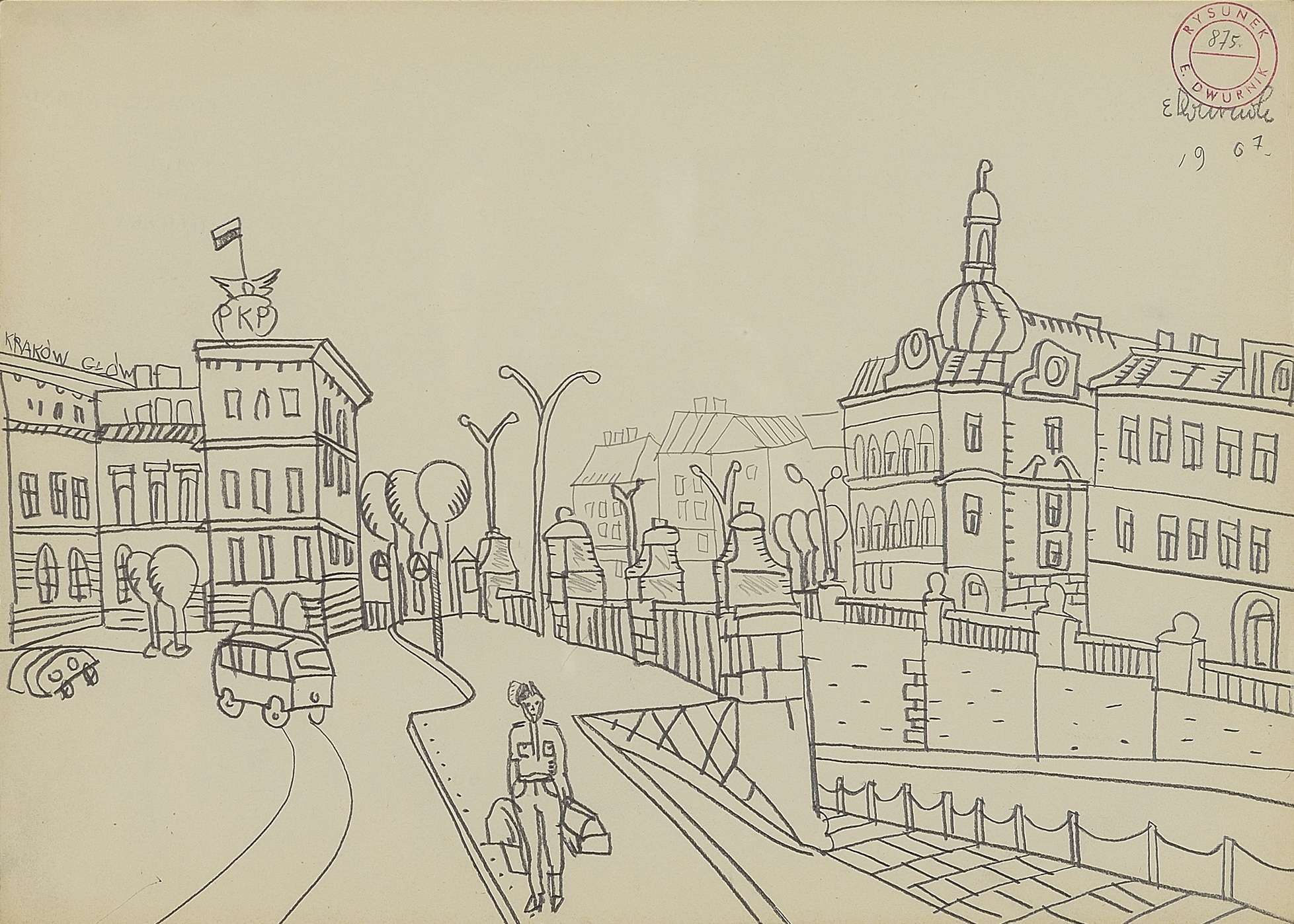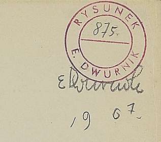sygn. p.g.: E. Dwurnik 1967, pieczątka Rysunek 875, na odwrocie pieczątka (cykl 34 Kraków).